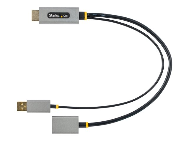 Le convertisseur HDMI vers DP est doté d'un câble de 30 cm entre les connecteurs HDMI et DP, ce qui réduit la tension sur les ports et les connecteurs. L'adaptateur comprend un câble USB-A de 30 cm pour la connexion à un port USB alimenté à proximité ou à un chargeur mural USB.