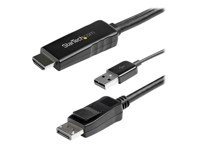 Ce câble HDMI vers DisplayPort de 2 m avec alimentation USB vous permet de connecter une source vidéo HDMI, comme votre ordinateur portable, votre ordinateur de bureau, votre lecteur Blu-ray ou votre appareil photo, à un moniteur ou un écran DisplayPort sans câbles vidéo supplémentaires. Ce câble adaptateur est doté de connecteurs mâles, ce qui vous permet de connecter votre source vidéo directement à l''écran, sans adaptateur ni câble supplémentaire.