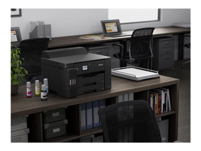 Outre le faible coût par page, cette imprimante EcoTank monofonction réalise facilement les travaux au format A3+. Les travaux A3+ peuvent être réalisés rapidement grâce aux vitesses d'impression élevées, aux deux bacs papier à chargement frontal de 250 feuilles et au chargeur de papier arrière de 50 feuilles. Imprimez selon vos préférences grâce à l'impression mobile, à la connexion Ethernet et à un écran couleur LCD de 6,1 cm doté de touches fixes.