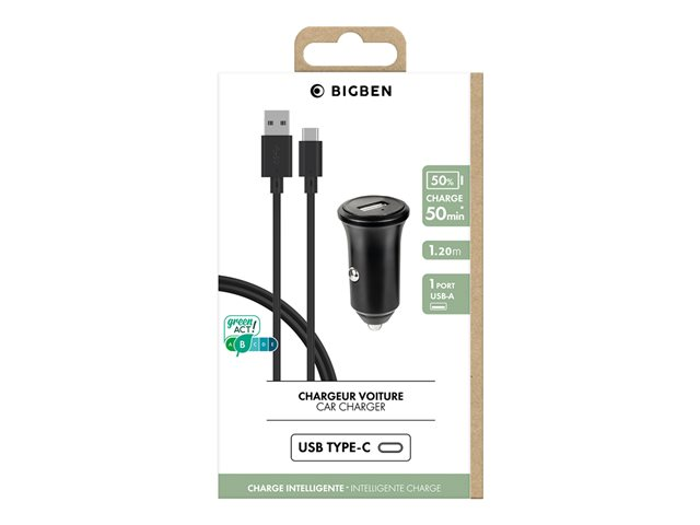 BIGBEN Connected - Adaptateur d'alimentation pour voiture - 2.4 A (USB) - sur le câble : USB-C - noir